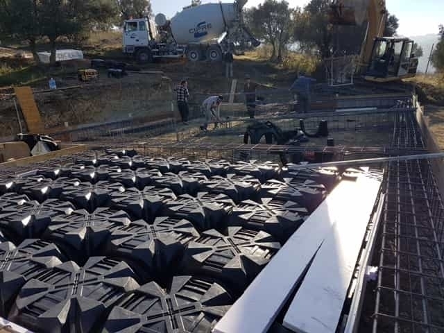 The modular, plastic Iglu’® formworks, placed side by side in sequence according to a predefined direction, make it easy to quickly create a self-supporting pedestrian platform above which a layer of is cast in order to easily and economically create a ventilated slab placed on pillars with the below cavity area available for the passage of systems but above all ventilated to counteract rising humidity and radioactive gases.